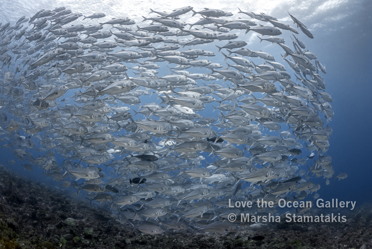 Large schools of Jacks will swim in unison and quickly rotate in a circle, rush to one side or the other, or change shapes as they stay together for protection. Combine a swift current, the fast movement of the fish, plus the shiny, reflective nature of these Jacks, and it can make them fun and challenging to photograph. This image, named Hurricane because the school swirled and swirled on the reef, ultimately forming a perfect Hurricane Shape.